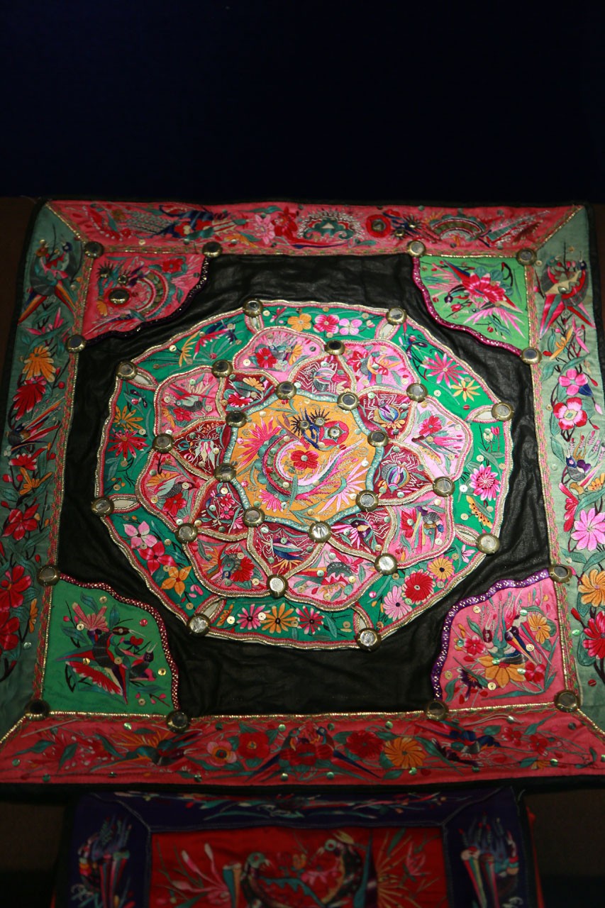 △凤鸟花蝶纹刺绣背带(盘龙纹八卦盘型刺绣背带盖),南宁市博物馆藏